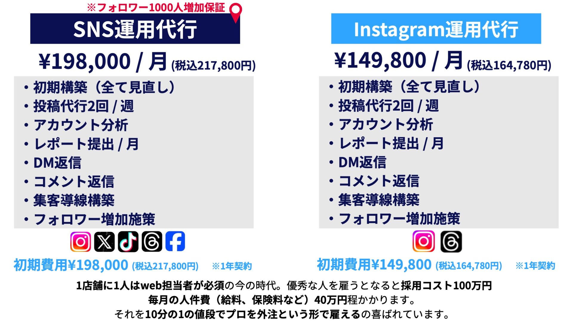 ※SNS運用代行プランは、もしも1年間で総フォロワーが1000人増加しなかった場合、1年以降1000フォロワー増加まで無償でサポートします。(フォロワー数よりも売上に繋がる運用の方が大事ですが、1000フォロワー増加は保証します)